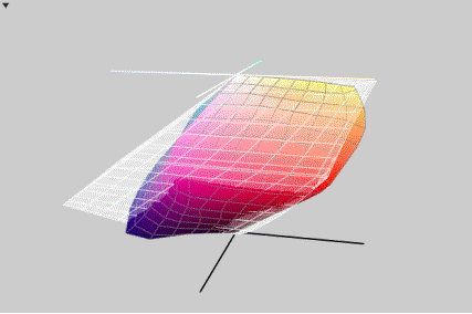 Let’s take a look at the following two images, where Adobe RGB is represented by the white wireframe. The first image compares the color gamut of the Apple 30-inch display to Adobe RGB.